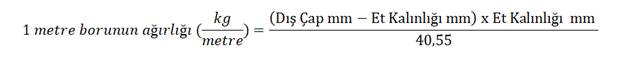 Yapacağımız işlem; boru dış çapından et kalınlığını çıkartmak, çıkan sonucu tekrar boru et kalınlığı ile çarpmak, buradan çıkan sonucu da 40,55 sayısına bölmek. İşte bu kadar basit!